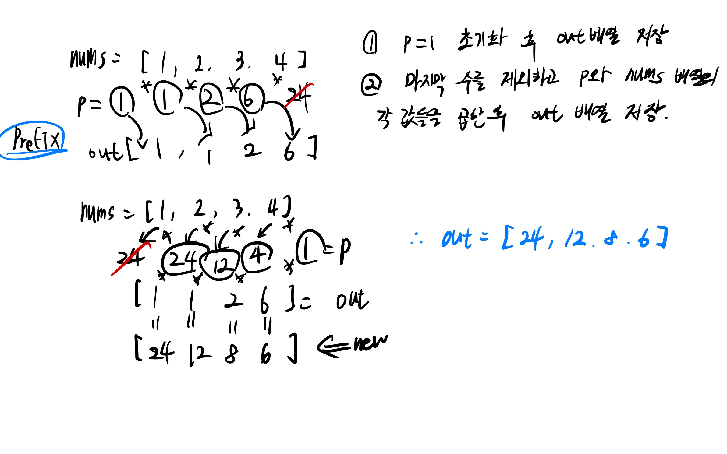아래와 같은 방식으로 prefix, suffix 곱셈을 수행해주면 자기 자신을 제외한 나머지 수들에 대한 곱을 구할 수 있다.