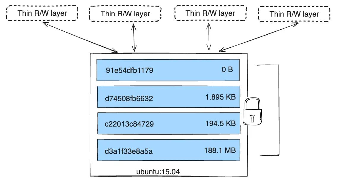 각 컨테이너에는 쓰기 가능한 자체 컨테이너 레이어가 있고 모든 변경 사항이 이 컨테이너 레이어에 저장되므로 여러 컨테이너가 동일한 기본 이미지에 대한 액세스를 공유하면서도 자체 데이터 상태를 가질 수 있다. 아래 다이어그램은 동일한 Ubuntu 15.04 이미지를 공유하는 여러 컨테이너를 보여준다.