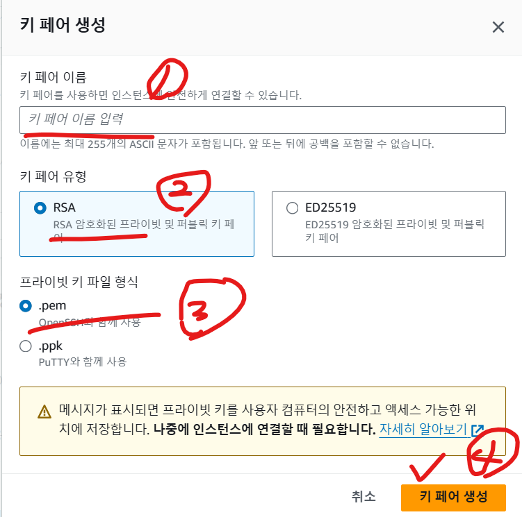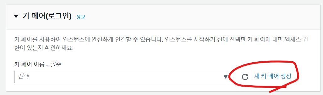 키 페어를 생성해주어야 한다. 키페어 이름 입력, 키 페어 유형(RSA), 키 파일 형식(.pem)을 선택하고 키 페어 생성 버튼을 클릭한다.