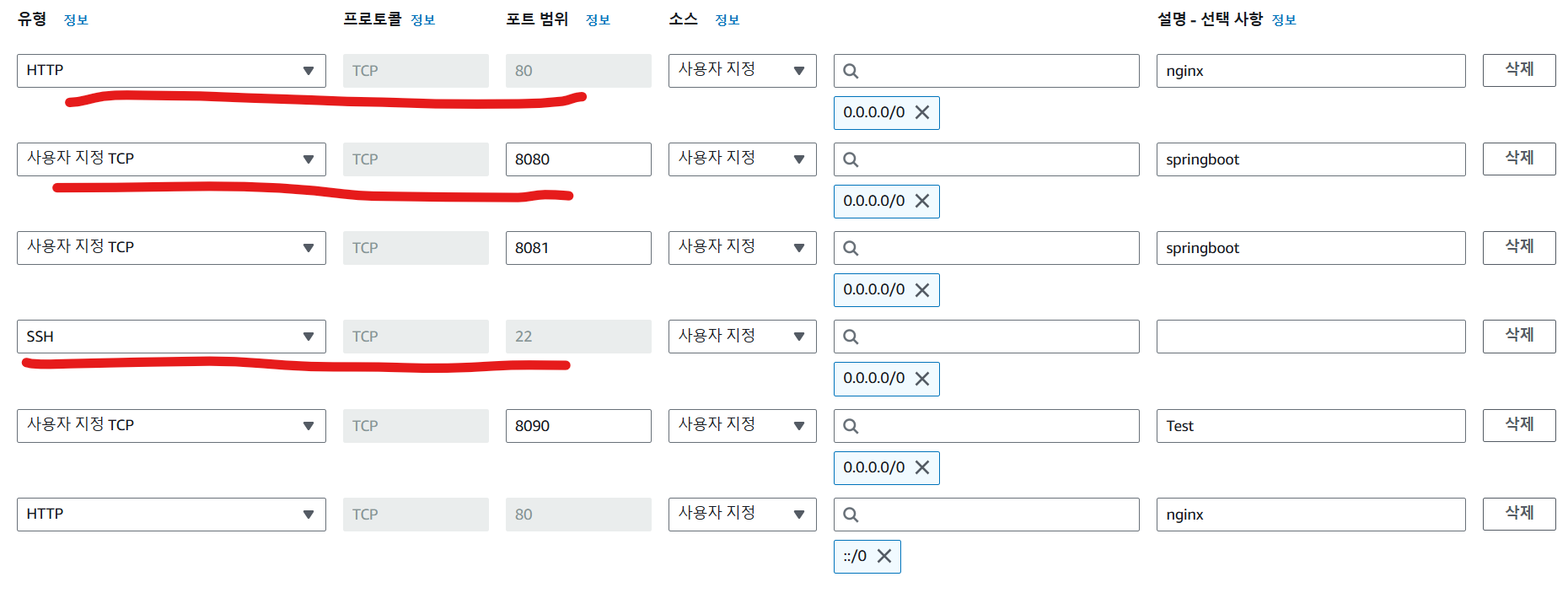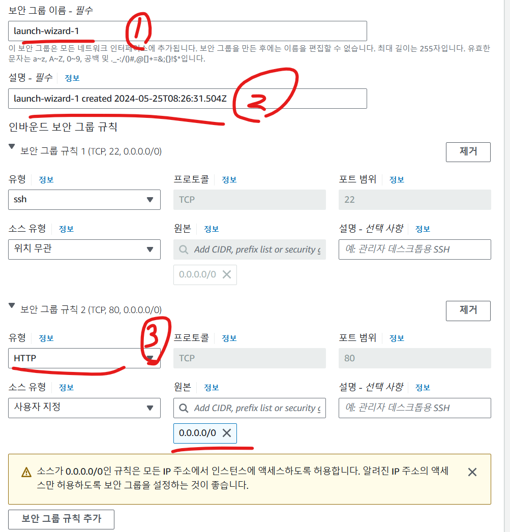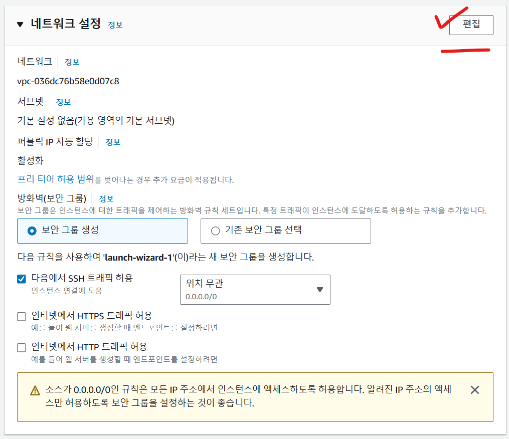 네트워크 보안 그룹도 설정한다. 오른쪽 상단의 편집을 클릭하고, 보안 그룹 이름과 설명, 인바운드 보안 그룹 규칙을 입력한다. 보안 그룹 이름과 설명은 원하는대로 수정해도 되고, 안해도 상관없다. default로 제공되는 규칙은 SSH이고, 우리는 nginx를 사용할 예정이기에 80번 포트(HTTP)를 허용해줘야 한다.