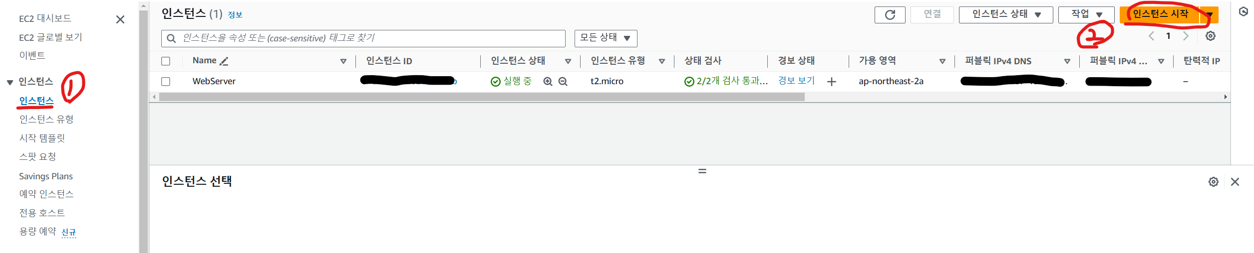 - AWS 계정을 생성하는 과정은 생략하겠다. AWS에 접속하고, 검색창에 EC2를 검색한다. 인스턴스에 접속하여 인스턴스 시작을 누른다.