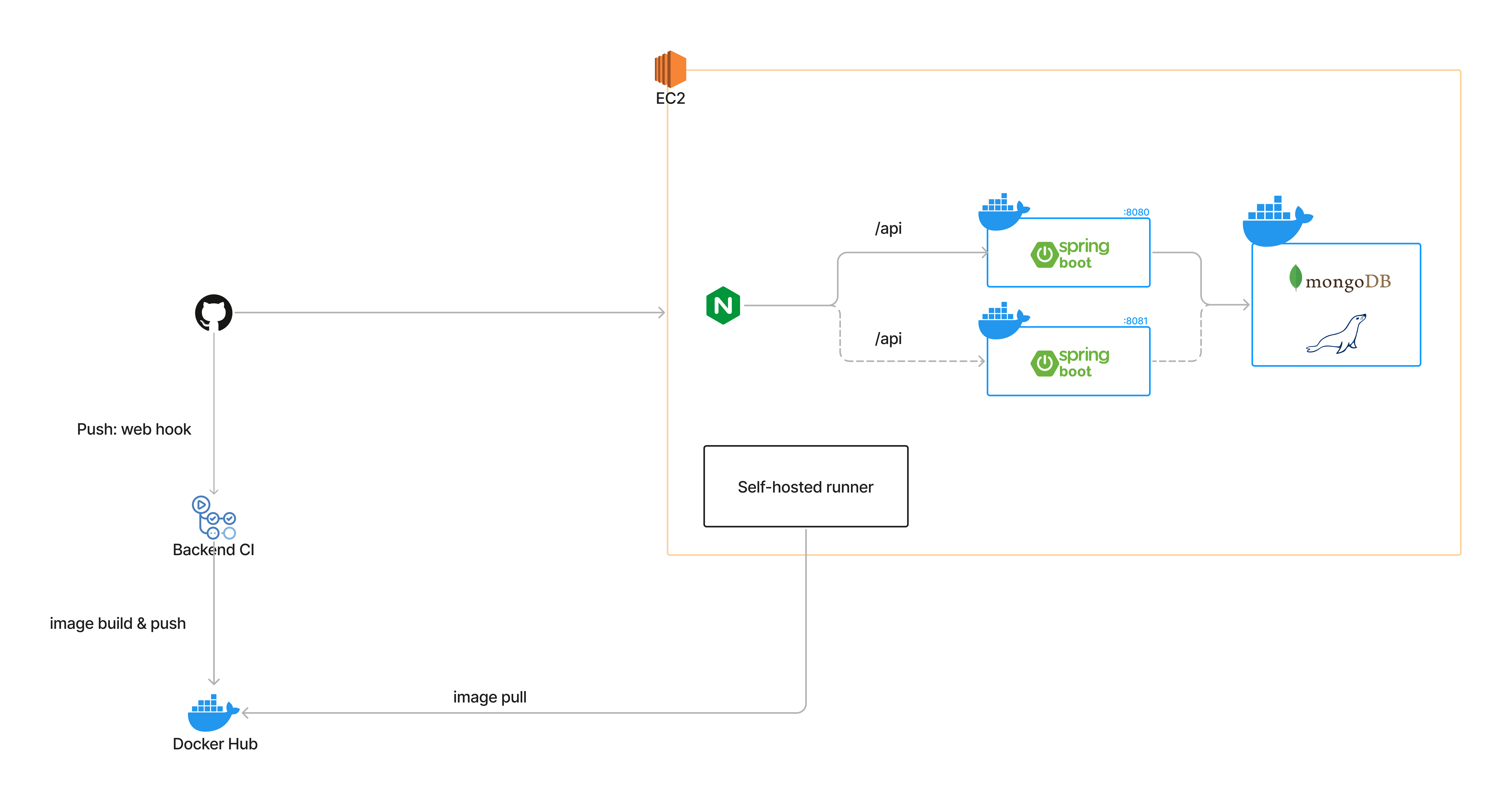 가장 흔히 알려진 방식으로 롤링 배포 방식이 있다. 다른 배포 방식이 궁금하다면 https://hudi.blog/zero-downtime-deployment/ 를 참고하자. 해당 방식은 두 대의 서버를 사용한다. 하지만, 나는 EC2 한 대에 도커 컨테이너 두 개를 구축하고, 새 버전의 이미지가 올라올 때만 띄워서 교체하는 방식으로 선택했다. 이전에 선택한 방법은 AWS EC2에서 2개의 Springoot Jar 파일을 포트번호만 달리하여 띄우는 방식이었다. 하지만, 내부적으로 문제가 발생함과 동시에 해당 방식은 무중단 배포가 아닌 것 같다는 결정을 내리고, Docker Compose를 이용한 방식으로 전환하게 되었다.
