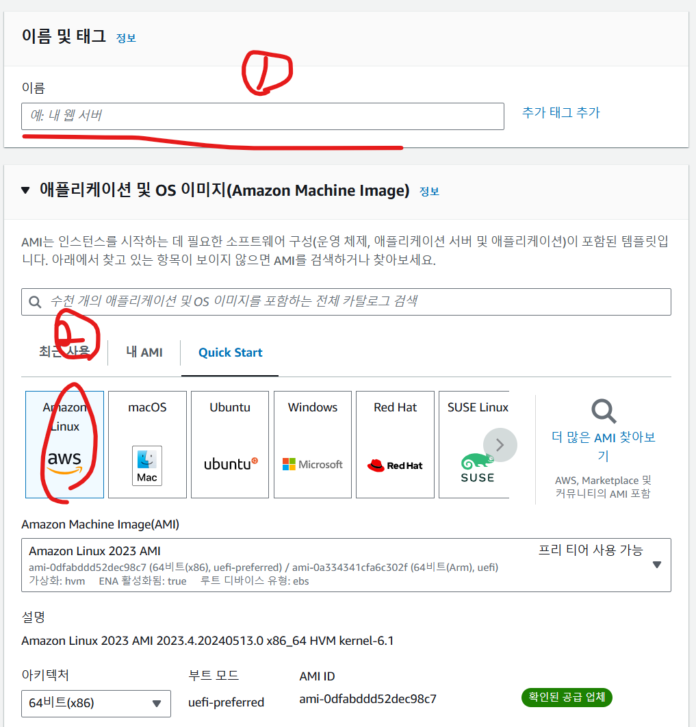 이름을 설정하고, OS 이미지를 선택한다. 나는 Amazon Linux를 사용하였다.