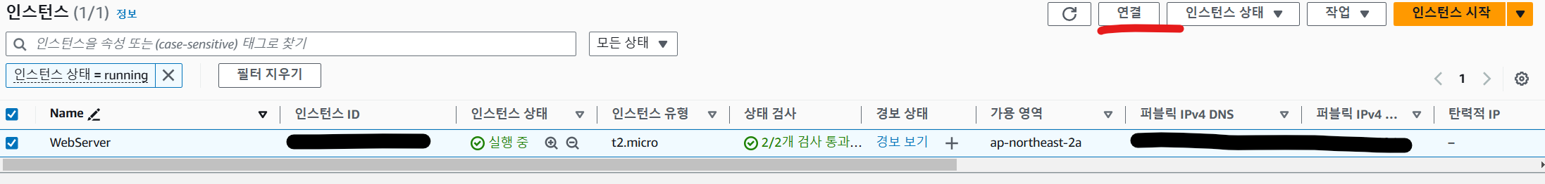 생성된 인스턴스를 누르고 "연결"을 클릭한다. EC2 인스턴스 연결로 바로 서버에 접속한다. 다른 방식으로 접속을 원하면 검색해보고 연결해보길 권장한다.