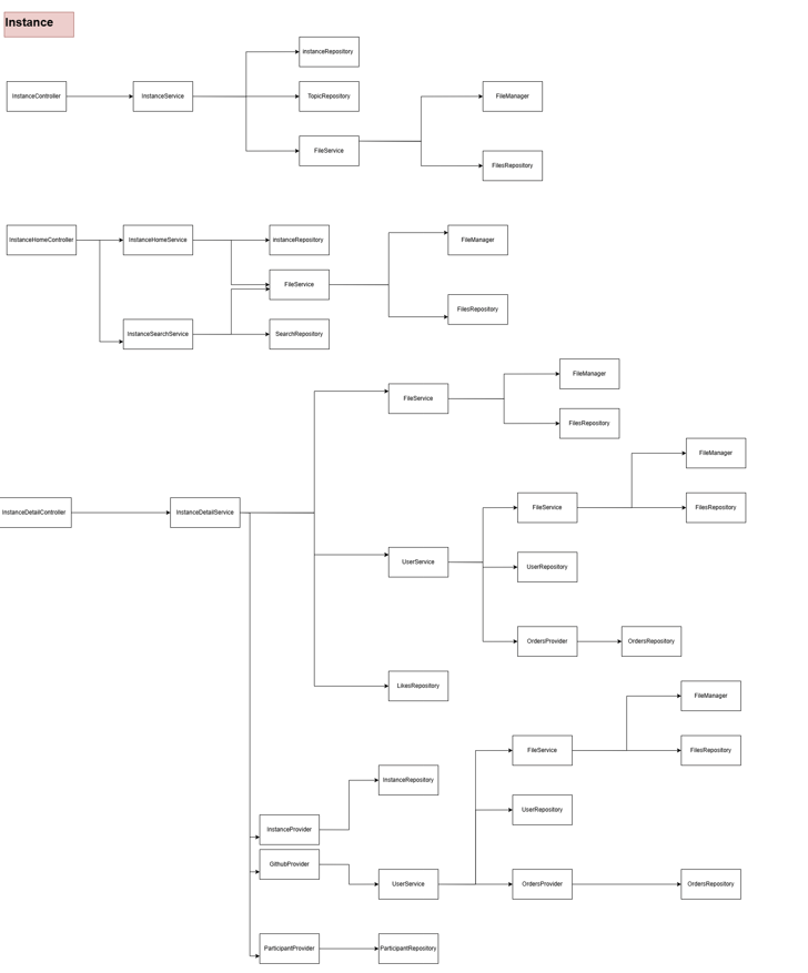 아래 그림을 보면 instanceService는 하나의 Service와 두 개의 Repository를 호출한다. 이 정도는 괜찮다. 하지만 instanceDetailService는 너무 복잡하여 설명하기조차 어렵다. 사실 이 부분은 프로젝트 초반부터 팀원과 함께 고민했던 부분이었다. 다행히 N+1 문제나 순환 참조 문제는 발생하지 않았고, 배포까지 무사히 진행되었다. 그렇다면 코드가 잘 작성된 것 아닌가? 겉보기에 괜찮아 보일 수도 있지만, 다른 도메인의 서비스들은 단일 책임 원칙을 지키지 않았고, 중복 호출되는 케이스도 있었다. 사실 설계할 때부터 이러한 부분들을 고려했어야 했지만, 우리는 작고 소중한 취업 준비생이었으니 어쩔 수 없었을 것이다. ㅎㅎㅎㅎ 결국 나와 백엔드 팀원은 2차 프로젝트 개발, 즉 코드 리팩토링과 성능 개선을 진행하기로 했다.