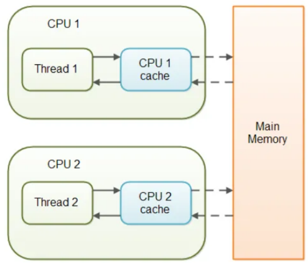 volatile 변수를 사용하고 있지 않는 멀티스레드 어플리케이션에서는 task를 수행하는 동안 성능 향상을 위해 메인 메모리에서 읽은 변수 값을 cpu cache에 저장하게 된다.