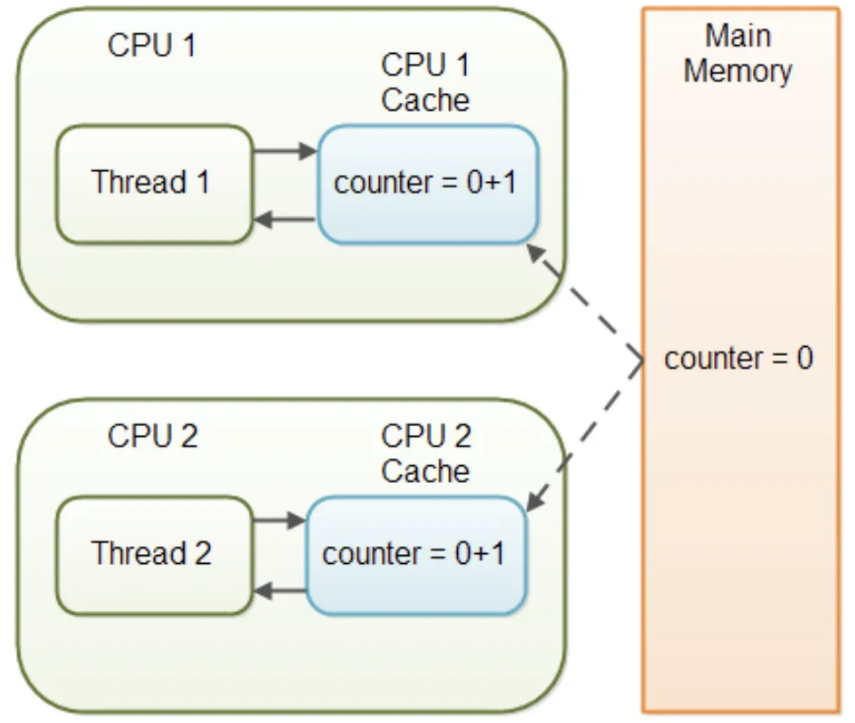 두개의 스레드가 1을 추가하는 연산을 하여 최종결과가 2여야하지만 각각 결과를 메인 메모리에 반영하게 된다면 1만 남은 상황이 발생한다.
