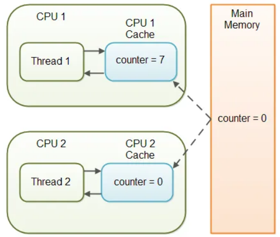 스레드 1은 카운터 값을 증가시키고 있지만, cpu cache에 반영되어 있고 실제로 메인 메모리에는 반영이 되지 않는다. 그렇기 때문에 스레드2는 카운터 값을 계속 읽어오지만 0을 가져오게 된다.